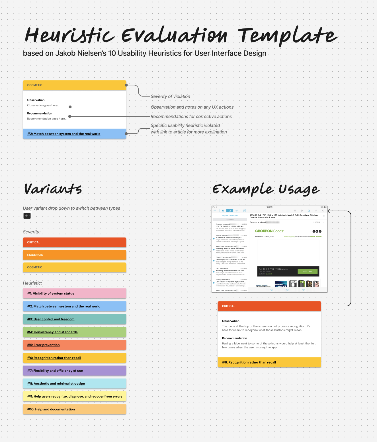 One year later, I did a more comprehensive design audit for the creation of a new interface for the verification system based on existing workflows in the old, core web application. For this design audit, I used Jakob Nielsen’s 10 usability heuristics as a rubric. And I used FigJam to capture my findings and recommendations while pointing them to the exact issue areas in screenshots of the application.